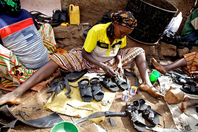 Kanessa Ayano, 24, owns a shoe making business and through her Mercy Corps facilitated business classes, she has learned how to increase her profit margins by creating an enhanced product which has created a stronger demand for her shoes. The original shoe was made entirely from tire rubber. Now, she is using discarded skins from animals after harvest to make more decorative sandals.